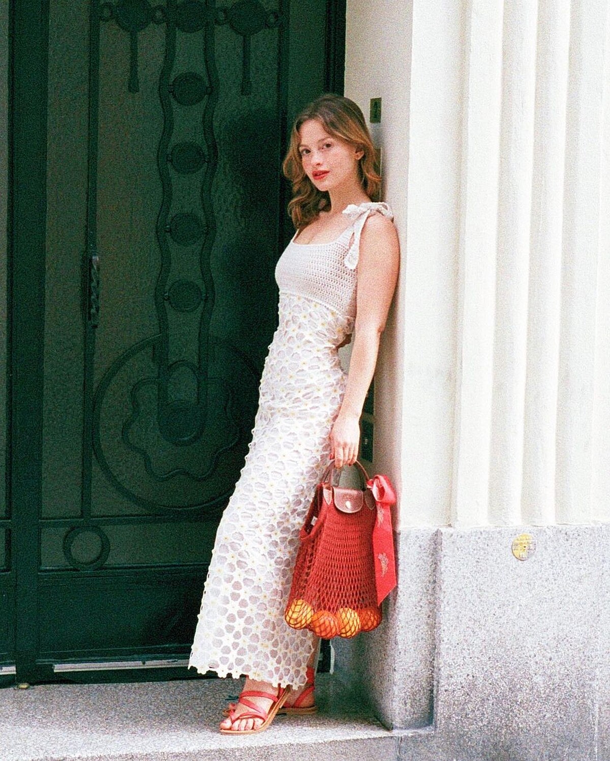 這條白色的英式刺繡洋裝既優雅又帶點鬆弛感。搭配上紅色細帶涼鞋和編織提包,色彩的對比讓整體造型更生動吸引目光。