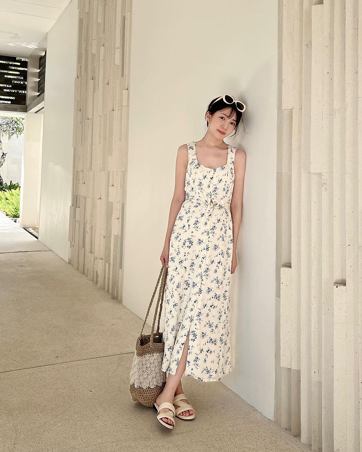 帶有法式浪漫風格的碎花洋裝,絕對是夏天的好選擇。配上編織提包和涼鞋,輕鬆打造出田園風情。