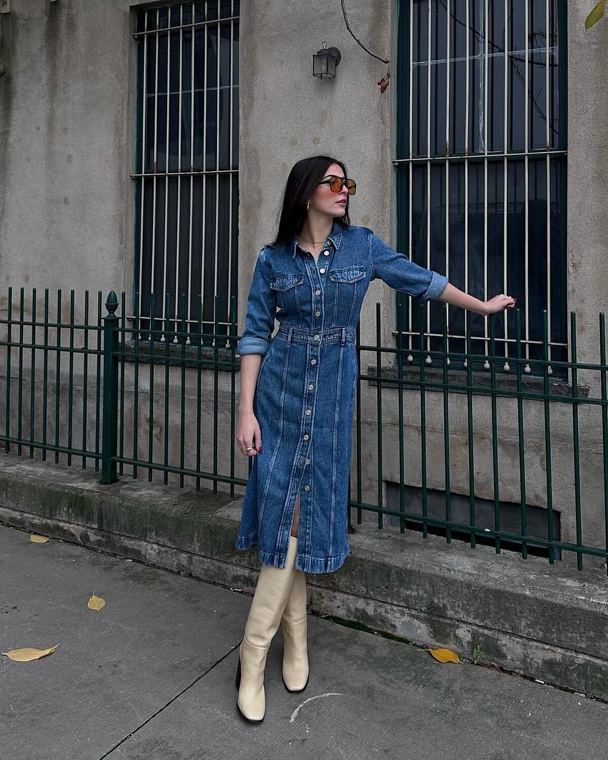 經典的牛仔襯衫洋裝配上靴子,感覺帥氣又不羈。如果想要更加豐富,可以考慮加入同色系的皮質配件,像是腰帶和皮包。