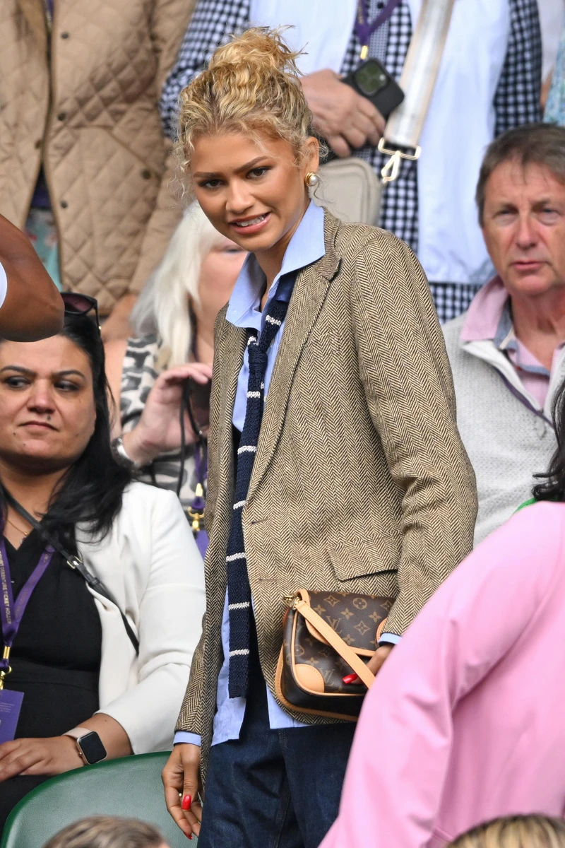 有點可惜的是今年溫網不見小蜘蛛湯姆霍蘭德Tom Holland,千黛亞便穿上男裝造型,連同男友的份一起耍帥。她帶來兩套Look,分別是復古的棕色花紋西裝搭配針織領帶,中性穿搭獲得好評,另一套白色連身西裝裙,同樣是正式感的造型,這兩天裡千黛亞手中拿的都是Louis Vuitton的手袋,而她看球時不斷變換的誇張表情包,也是一個可愛亮點。