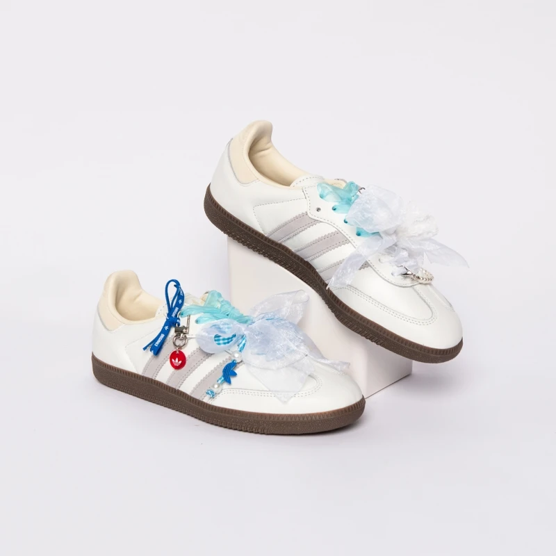 百萬YouTuber美食水水千千在經典的Samba OG鞋款上打造甜美的Summer Balletcore風格,以水藍色與白色緞帶營造清新主色調,再混搭格紋及蕾絲以及大蝴蝶結增添可愛元素。