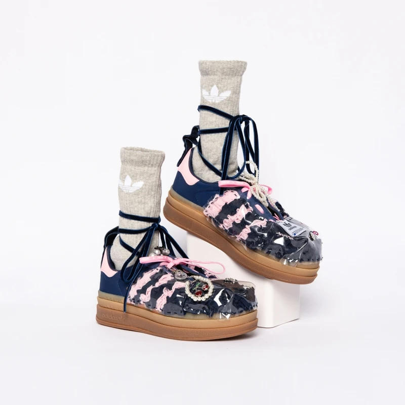 視覺藝術家謝昕妮Sydney Sie則是以極繁Y2K風格為靈感,在GAZELLE BOLD鞋款化作貼紙簿,並將鞋子改造成瑪莉珍鞋型,三葉草掛飾與粉色三葉草鞋帶對比深藍鞋面呈現有個性的甜美風格。