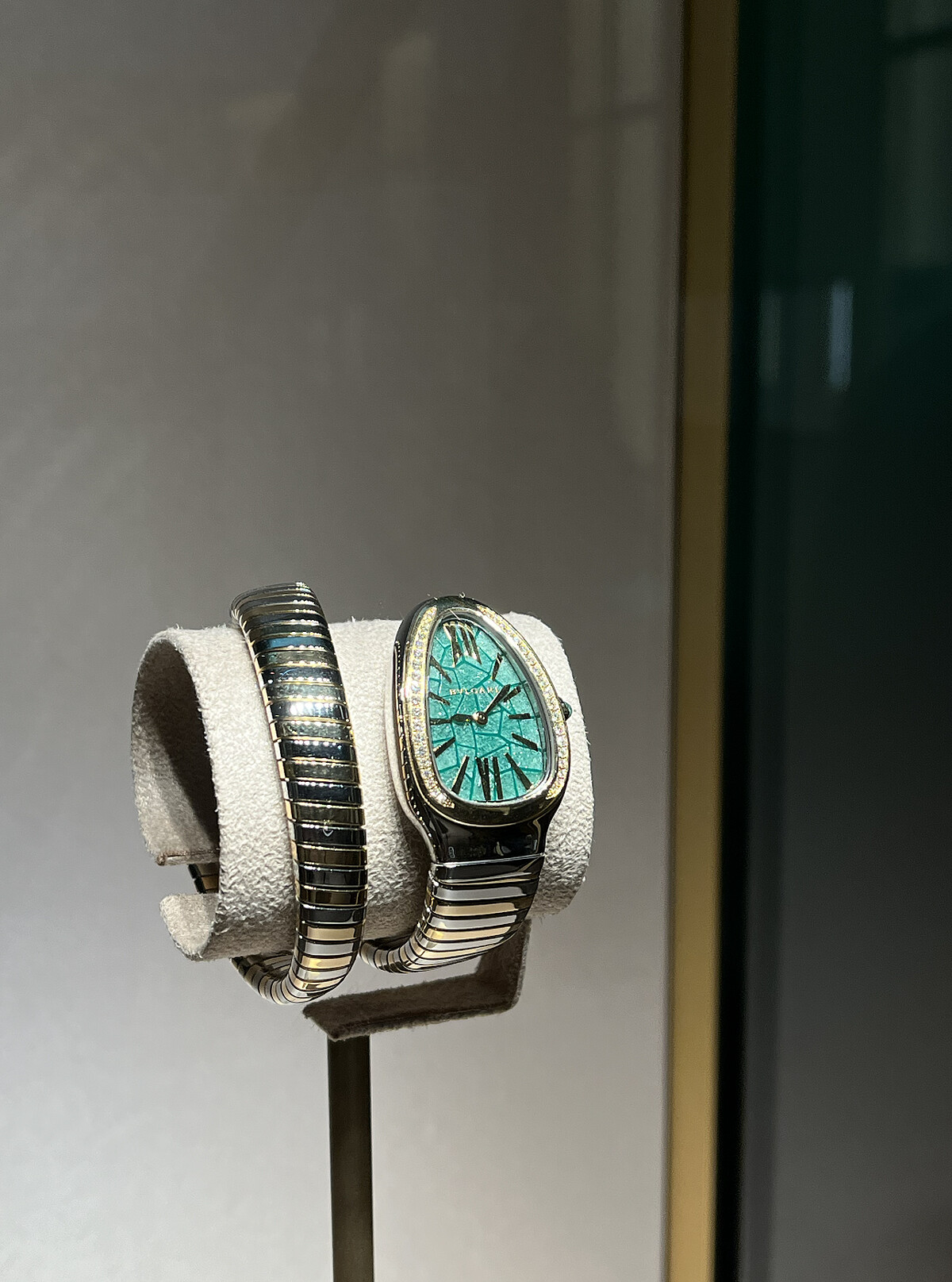 4)Serpenti系列首次跨界藝術合作Serpenti Tubogas安藤忠雄限量腕錶亦精彩亮相,特別款腕錶從安藤忠雄鍾愛的主題——四季流轉的自然美景中捕捉創作靈感,匠心運用綠色砂金石、虎眼石以及白色或粉色珍珠母貝,在經典靈蛇主題腕錶的錶盤上描摹出森林隨四季變幻呈現的綺麗盛景,在建築師設計的空間裡燦然輝映。