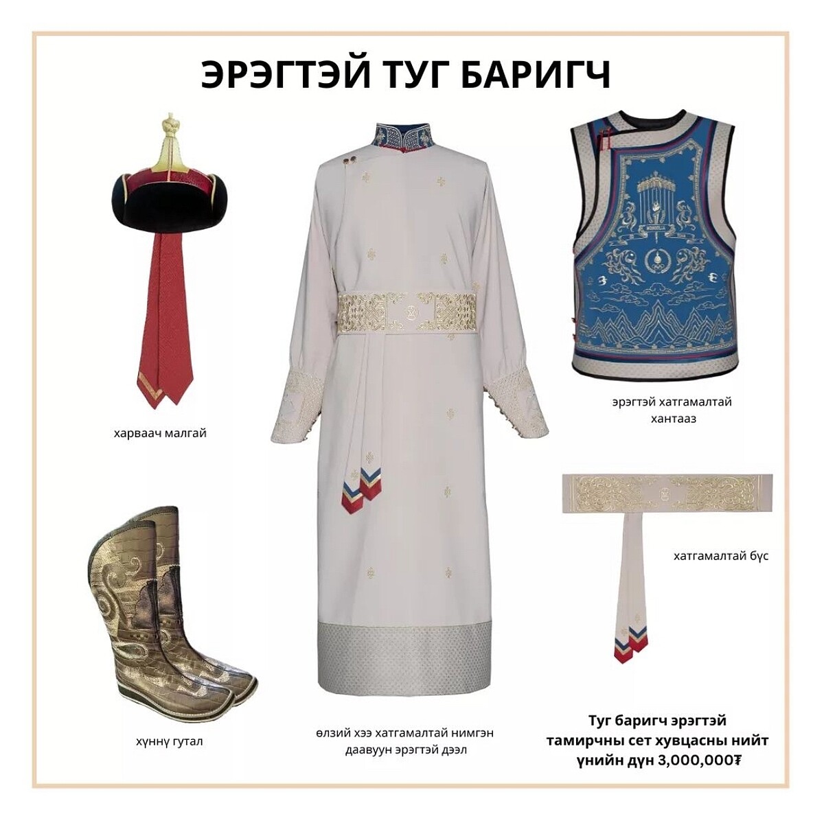 在各國一眾西服或運動風格的造型中,以傳統服飾作為基礎而生的蒙古隊進場隊服直接成為最受注目的服裝,精緻的古風長袍搭配上刺繡背心,展現絕佳神聖優雅的姿態,而背心上的金線刺繡更是具有深意,是以蒙古國代表權力象徵的九斿白纛(亦稱為:九尺白旗)結合奧運聖火火炬的圖樣以及奧運五環等圖案而成,象徵運動員具備的努力、毅力、意志力,也代表通往勝利的巔峰之路,更包含著不屈不撓、實現目標的寓意。