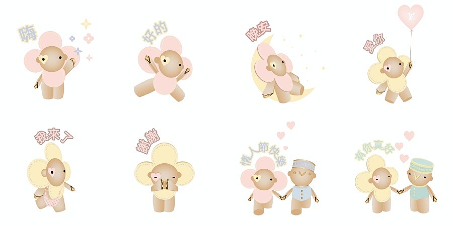 本次的七夕限定貼圖共八張,以柔和粉嫩馬卡龍色系為主色調,搭配上日常且貼心的實用對話,包括嗨、 我來了、好的、謝謝、晚安、愛你、有你真好、情人節快樂,無論身邊有沒有另一半都可以感受到Louis Vuitton線上的甜蜜小禮。