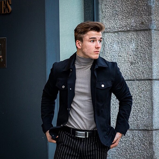Felix少見的微正裝造型,以合身的短高領搭配深色襯衫外套,展現豐富的層次感,而下身選擇的是直條紋的西裝長褲,也能修飾拉長身形。