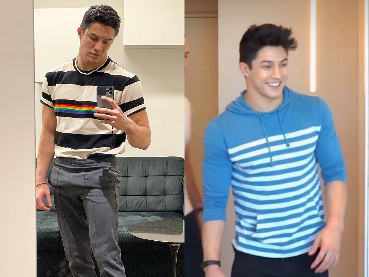 不同款式的條紋上衣讓造型有了變化,對於已經公開出櫃Arthur Nory來說,在日常的穿搭中加入彩虹旗的小巧思,也非常適合有同志天菜之稱的他!