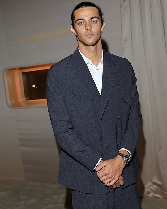 在受邀參加OMEGA品牌活動的Thomas Ceccon,一身深灰色西裝搭配白襯衫的造型,並將一頭及肩長髮後梳紮起,俐落中又因為沒打上領帶有了不羈的個性感。