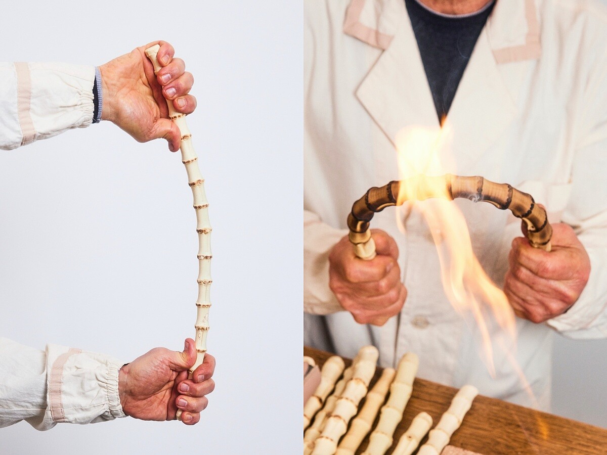 要將新鮮且飽含水分的竹子製作成提把耗時13個小時,背後需要的工藝遠比看起來繁複,從竹子的挑選需要高質量並粗細相仿之外,富含水份的新鮮竹筒在經過高溫火烤加熱軟化後,須經由經驗老到的工匠們手工將竹節彎曲成理想的弧度,而火烤後竹節上留下的黑色焦跡,每一款都是獨一無二的。
