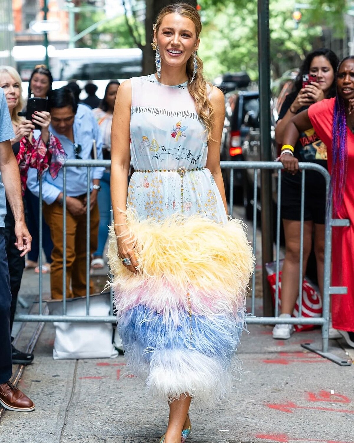 為符合角色主題,Blake Lively多次選擇以植物花卉、小昆蟲元素聞名的紐約設計師品牌Dauphinette,像是這身彩色的羽毛裙,上身印有小精靈、蝴蝶等童趣圖案,Christian Louboutin的高跟鞋遵循同一紅黃藍的柔嫩色系,手指上則戴滿了Lorraine Schwartz的巨大寶石戒指。