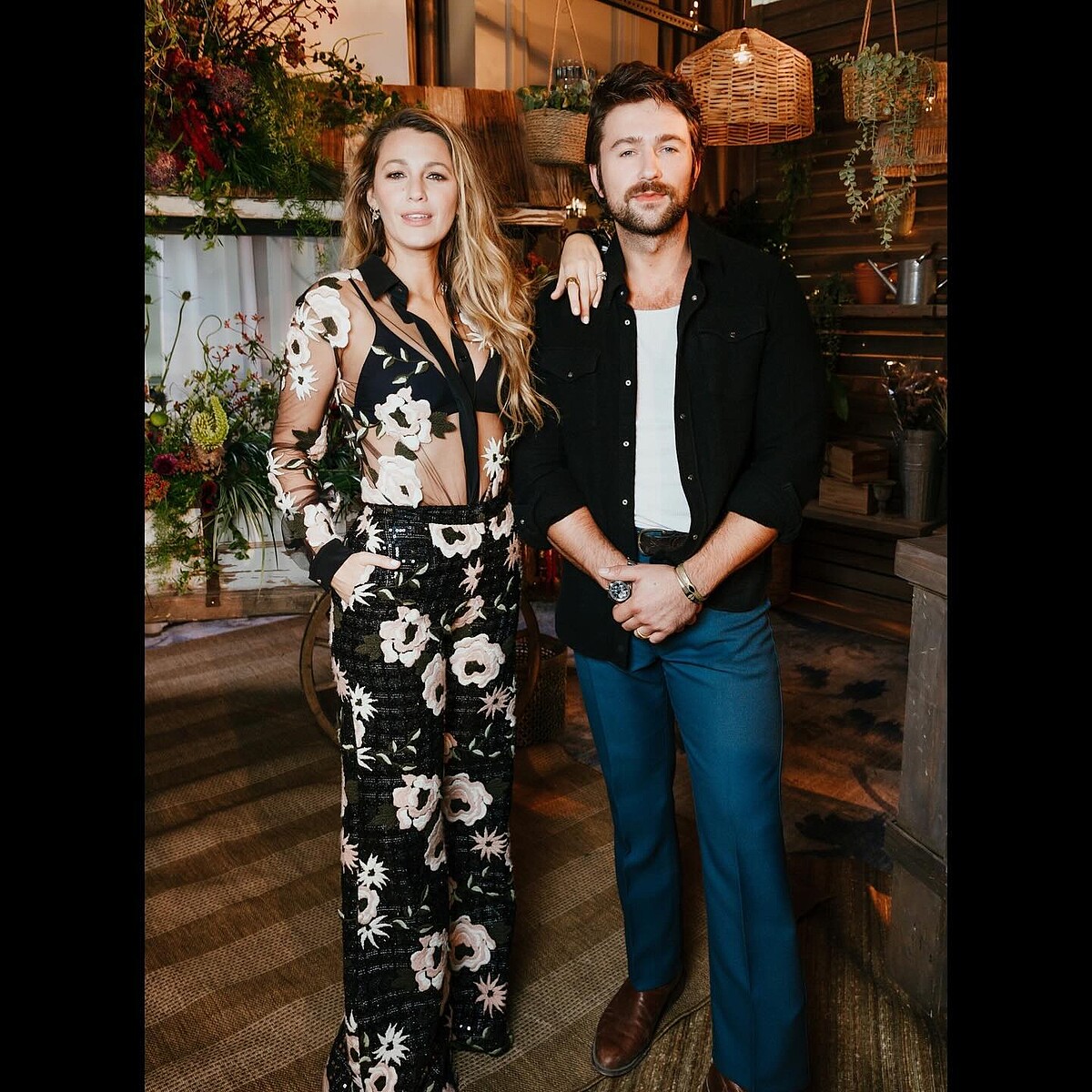整身的碎花是容易顯得NG的搭配,但是Blake Lively這麼做了,她穿著Chanel的碎花T恤與同樣飾滿碎花圖案的牛仔褲裝,搭配一顆山茶花小銀包,在她身上看起來是這麼合理,尤其是以一位花店闆娘來說。