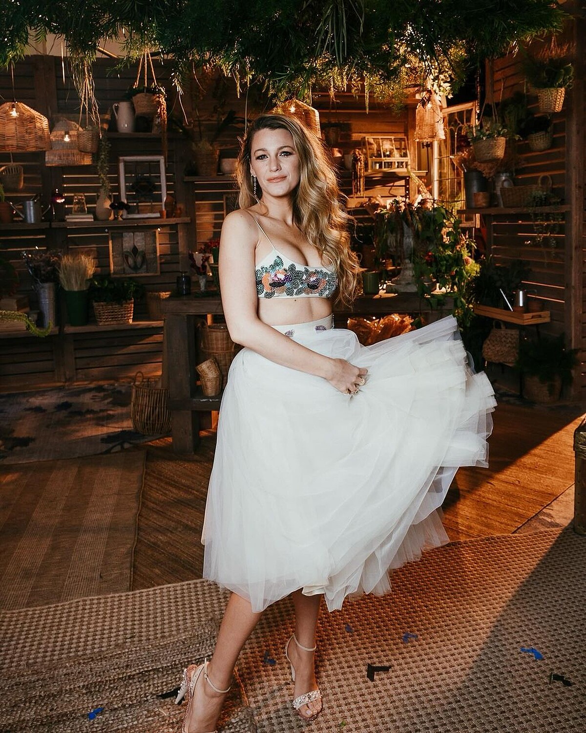 Blake Lively身穿1994年的復古 Vivienne Westwood 掛脖連衣裙,白色基底上飾有浪漫的花園印花,再次搭配 Christian Louboutin 高跟鞋,並持續繁複疊戴的飾品風格。