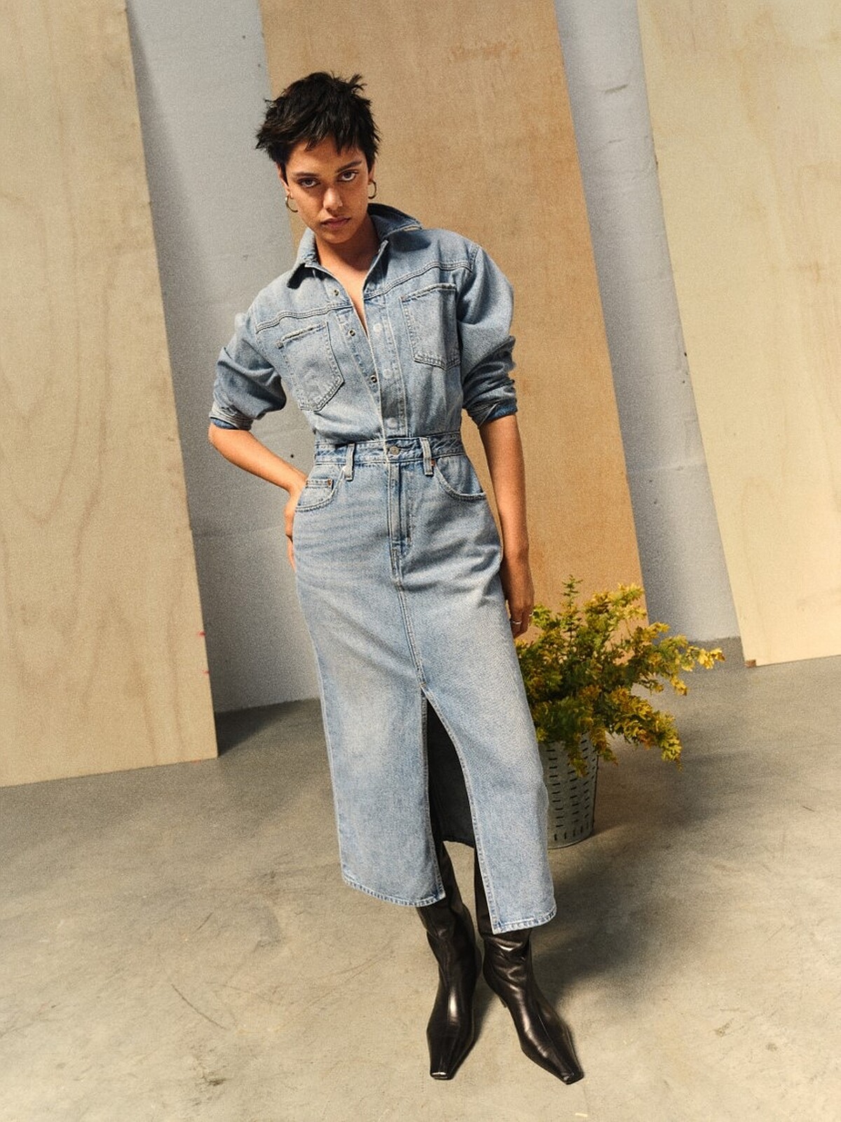 俏皮活潑的丹寧短裙夏日必備,此次推出的丹寧短裙裙擺帶有波浪設計,讓整體造型看起來更加甜美減齡。