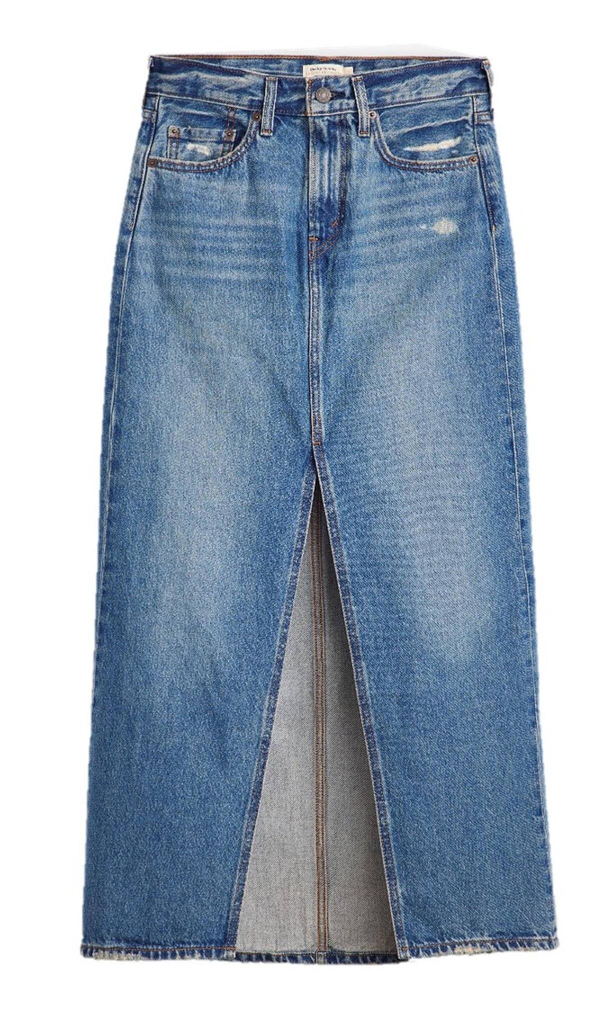 丹寧長裙採用大面積湛藍色調營造優雅沈穩感,A字版型更修飾腰、臀曲線。