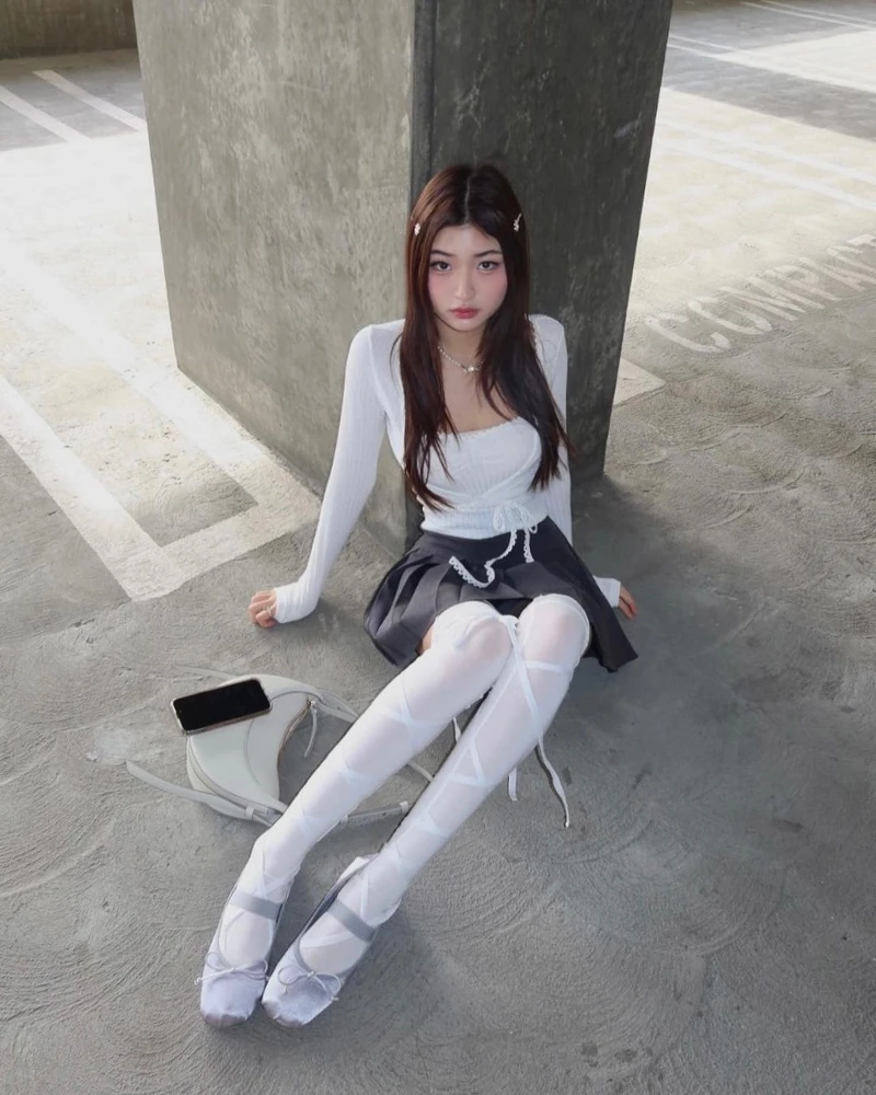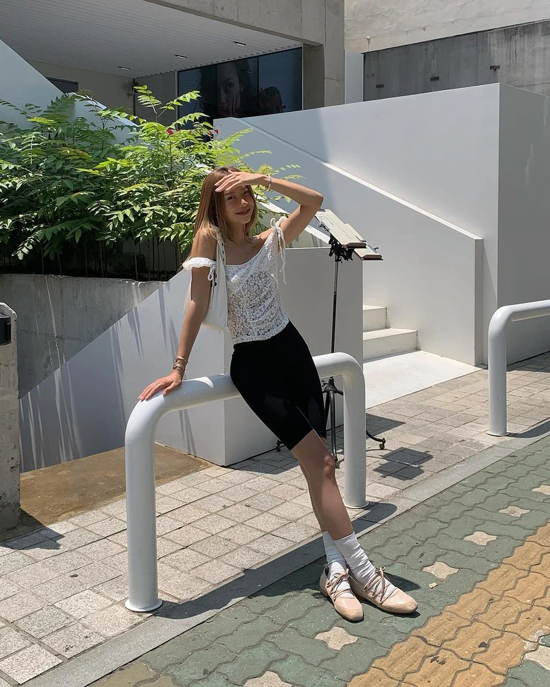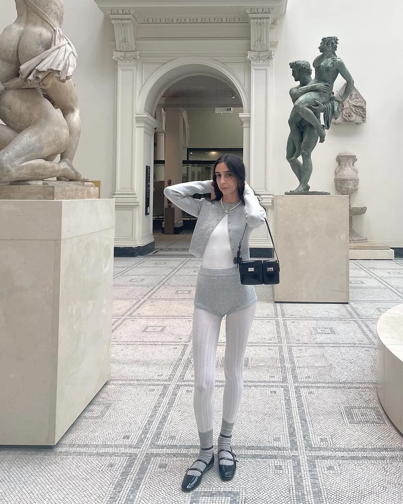 利用芭蕾舞練習套裝搭配芭蕾舞鞋輕鬆穿出Balletcore風格。緊身褲搭上針織短褲和襪子,大方露出身體線條展現女人味。覺得難度太高的話可以試試下身搭配紗裙。