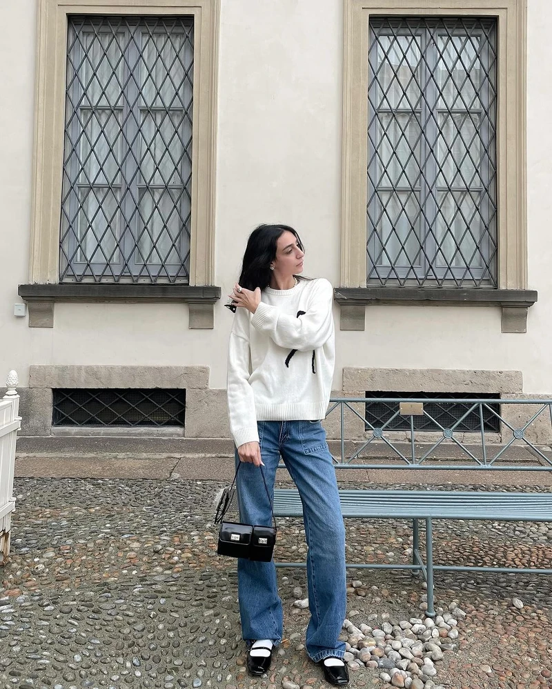 芭蕾舞鞋能夠很好的中和掉牛仔褲的休閒感,搭配上針織上衣還有飾品,讓穿搭效果更加精緻。