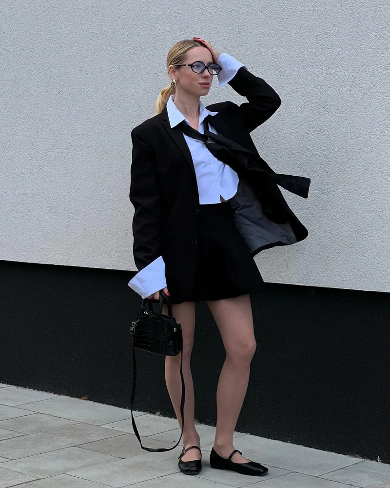 專業感的黑色西裝套裝,下半身的短裙搭配同色的芭蕾舞鞋,不穿襪子露出腳踝來平衡上下的重量感。