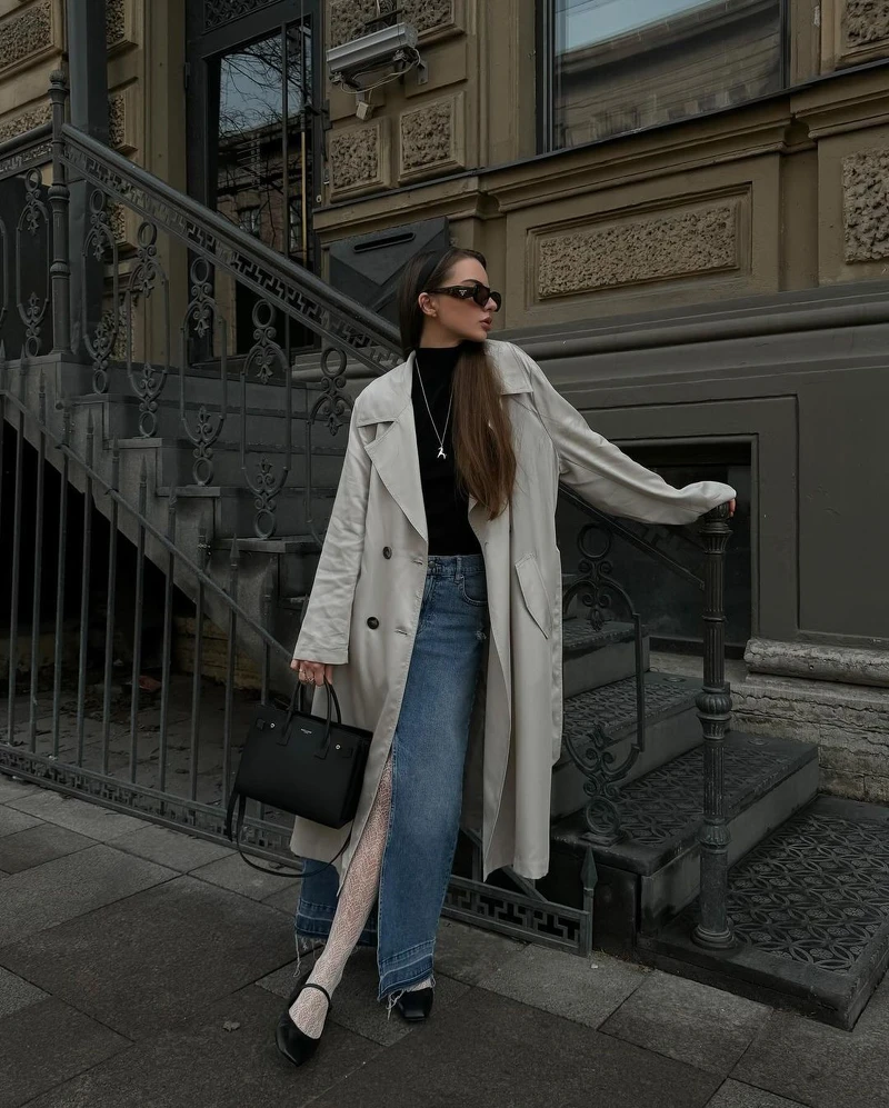 寬鬆的風衣搭配合身的上衣跟長裙,讓整體不會臃腫。牛仔裙的高開衩中露出的蕾絲絲襪,這個小心機很好讓芭蕾舞鞋融入穿搭中。