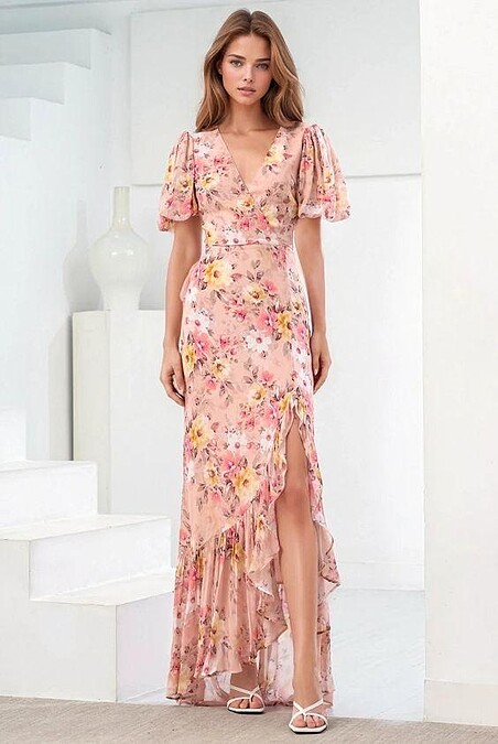 魚尾碎花洋裝的設計能夠完美勾勒出腰部和臀部的曲線,展現身形又融入了浪漫和溫柔的氛圍,是適合正式場合又充滿女性魅力的理想選擇。