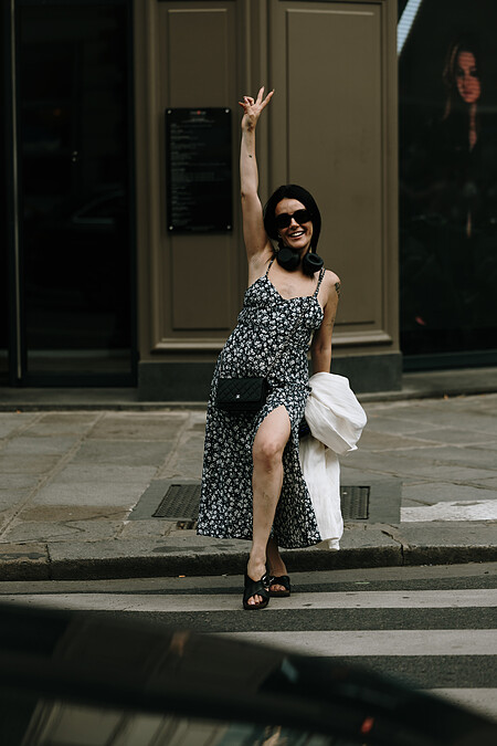 將西裝外套搭配碎花洋裝是一種舒適又時尚的搭配方式,巧妙地融合了浪漫與正式感。這樣的組合不僅展現了優雅氣質,還顯示了女性的專業和幹練。
