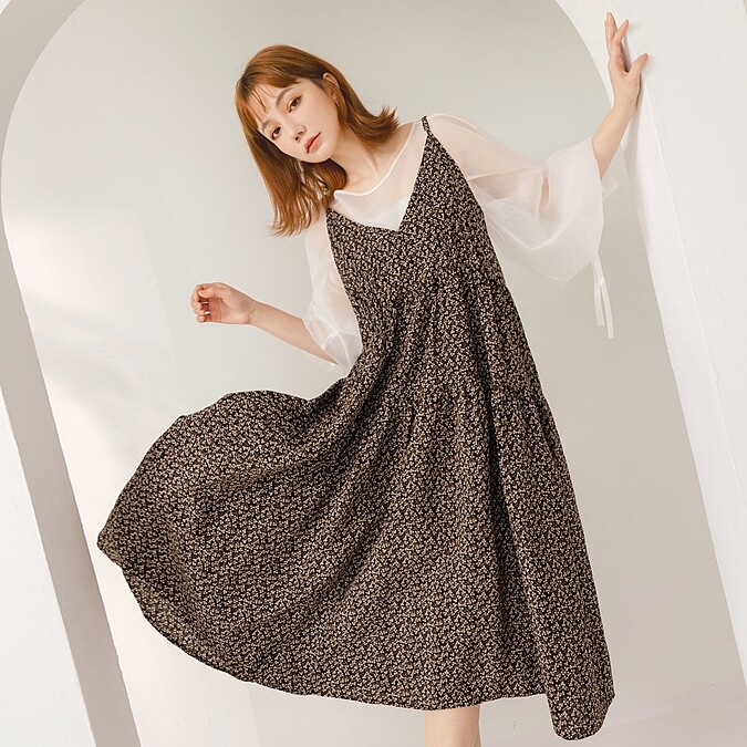 如果覺得單穿碎花洋裝缺乏層次感,可以在領口添加襯衫領,這樣可以增強整體的層次感和設計感,為碎花洋裝增添了獨特的風格,還使其更具特色更加出眾。
