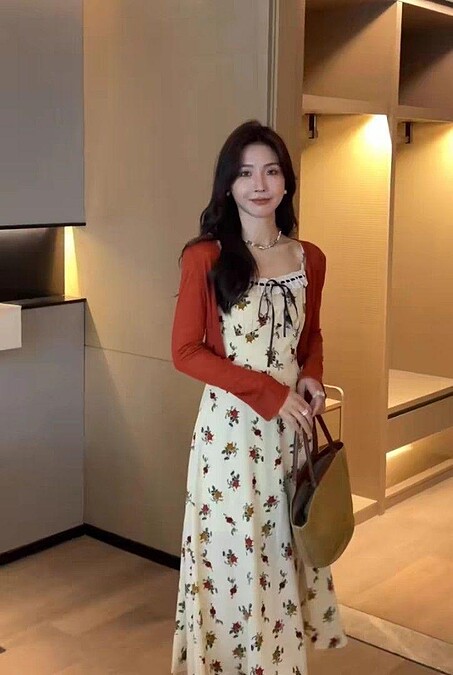 非常適合春秋季節或稍涼的天氣,增添了休閒和舒適感。針織開衫的顏色可以選擇與碎花洋裝的顏色相協調,避免色彩過多,讓整體造型更加和諧自然。
