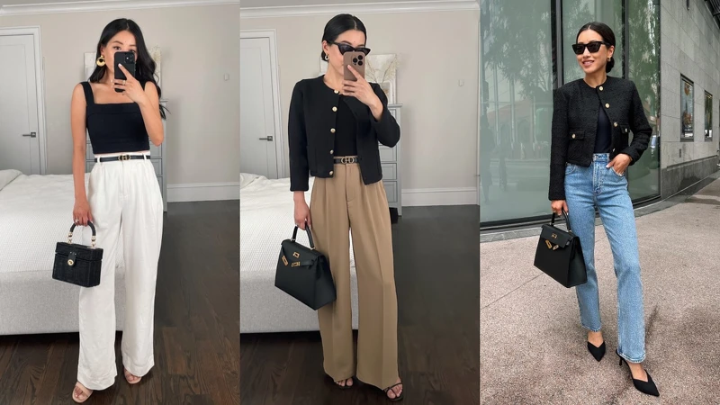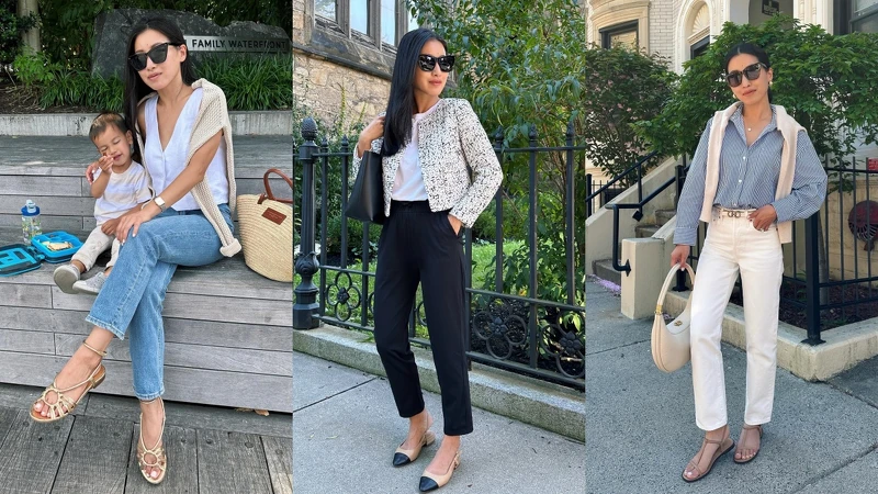 小個子的女生在穿搭中最怕碰到的就是「穿了長褲反而更矮」的問題,這邊可以看到Jean挑選的長褲幾乎都是以9分的長度為主,這樣露出腳踝的長度,就能很成功的讓下半身不會被長褲全部遮蓋,進而讓身形看來高挑,這部分還有一個亮點,就是Jean的鞋款也會搭配可以「延伸腳背」的款式,讓腿型更加修長。