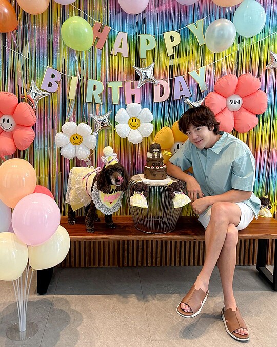 日前在幫狗狗Suni慶生時,張根碩頂著不修邊幅的髮型開心與狗狗合照,他穿著淺藍色的短袖襯衫與白色短褲,搭配輕鬆的拖鞋,與華麗七彩的布置比起來是樸素了些,但是看起來十分清爽、乾淨。