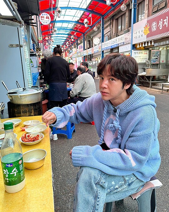 明星也愛小吃攤!張根碩在街邊大嗑美食,身上穿了顏色溫柔的藍紫色針織毛衣,還有粉色圖案點綴,讓他看起來特別有暖男的氛圍。