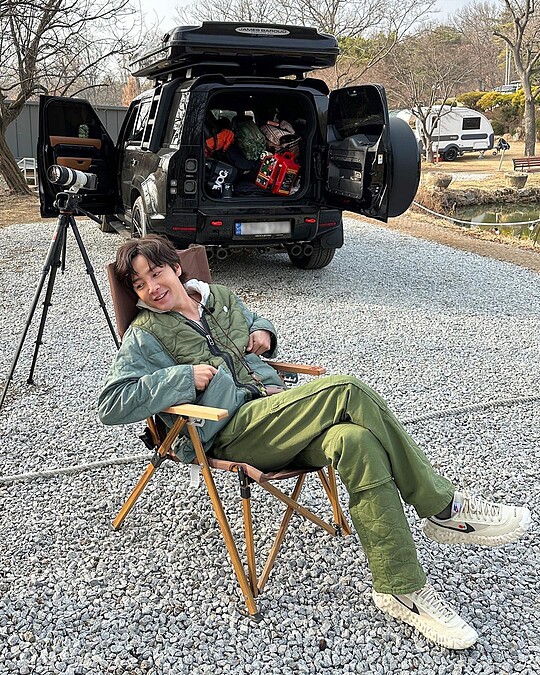 綠色也是張根碩私下很喜歡的顏色,像這組露營裝扮,他全身都是綠色單品組合!而上、下身皆有機能風的波紋絎縫紋路,則是個造型小細節。