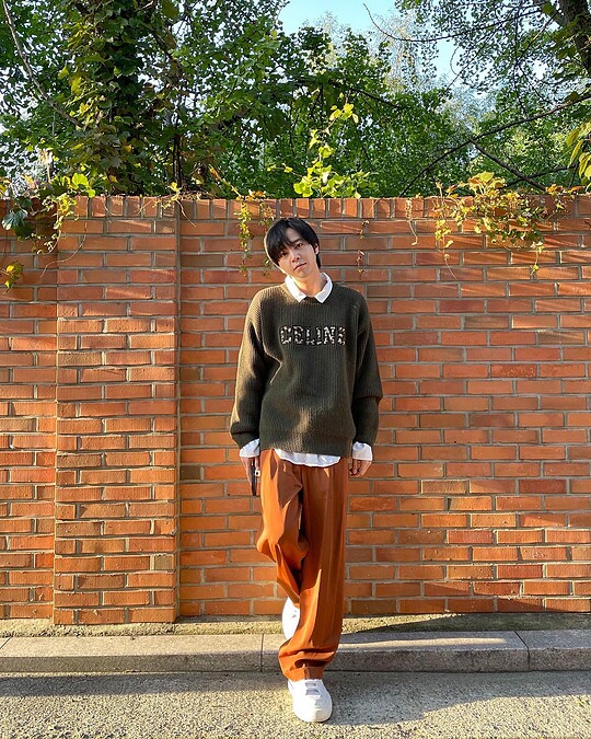 張根碩的街頭造型總是給人一種溫暖印象,他經常選擇柔軟面料的服裝,以舒適愜意為主,簡單的毛衣造型裡他內搭一件白襯衫來增添層次,寬鬆的焦糖色褲裝則製造出對比效果。