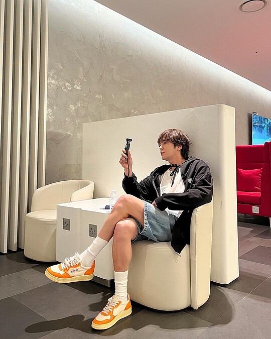 張根碩真的相當熱愛亮麗的色系,即使今天是走簡約的黑、白、丹寧基礎風格,他還是會運用一雙跳色的球鞋來當作亮點。