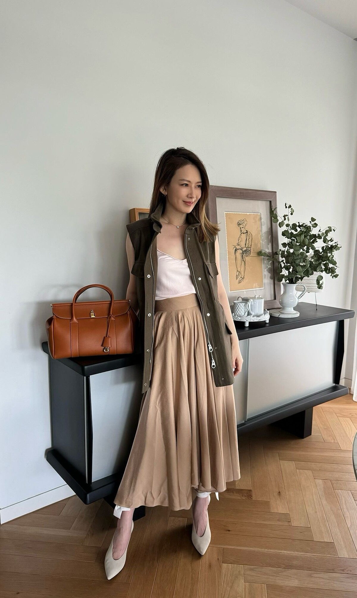 Melody則是選擇溫暖棕色的Loom手袋,來與一身氣質優雅的裙裝相襯,營造溫柔知性的氛圍。