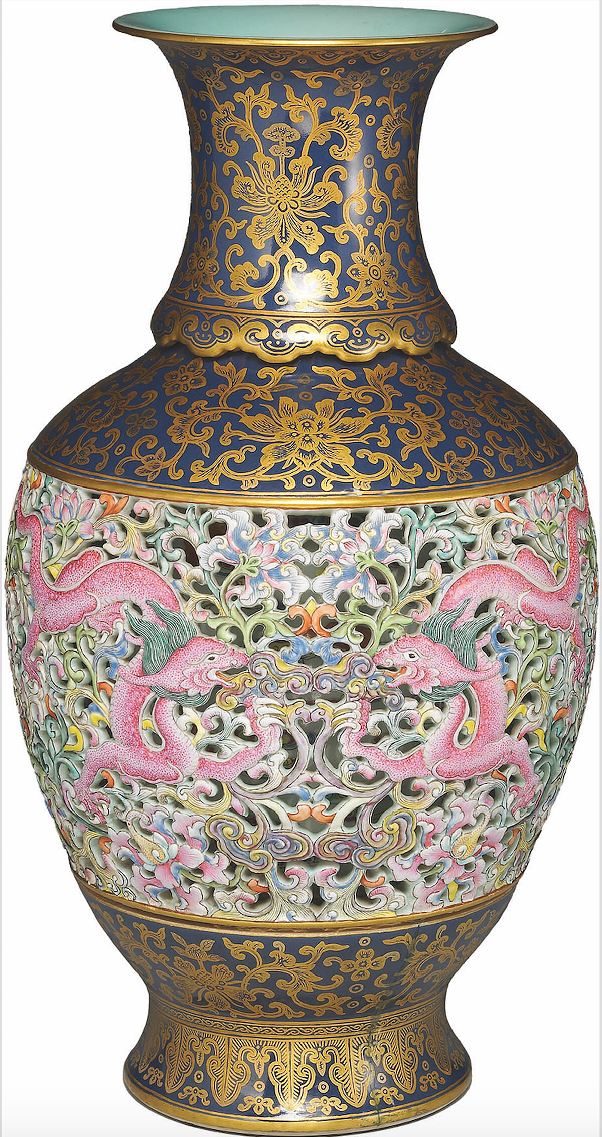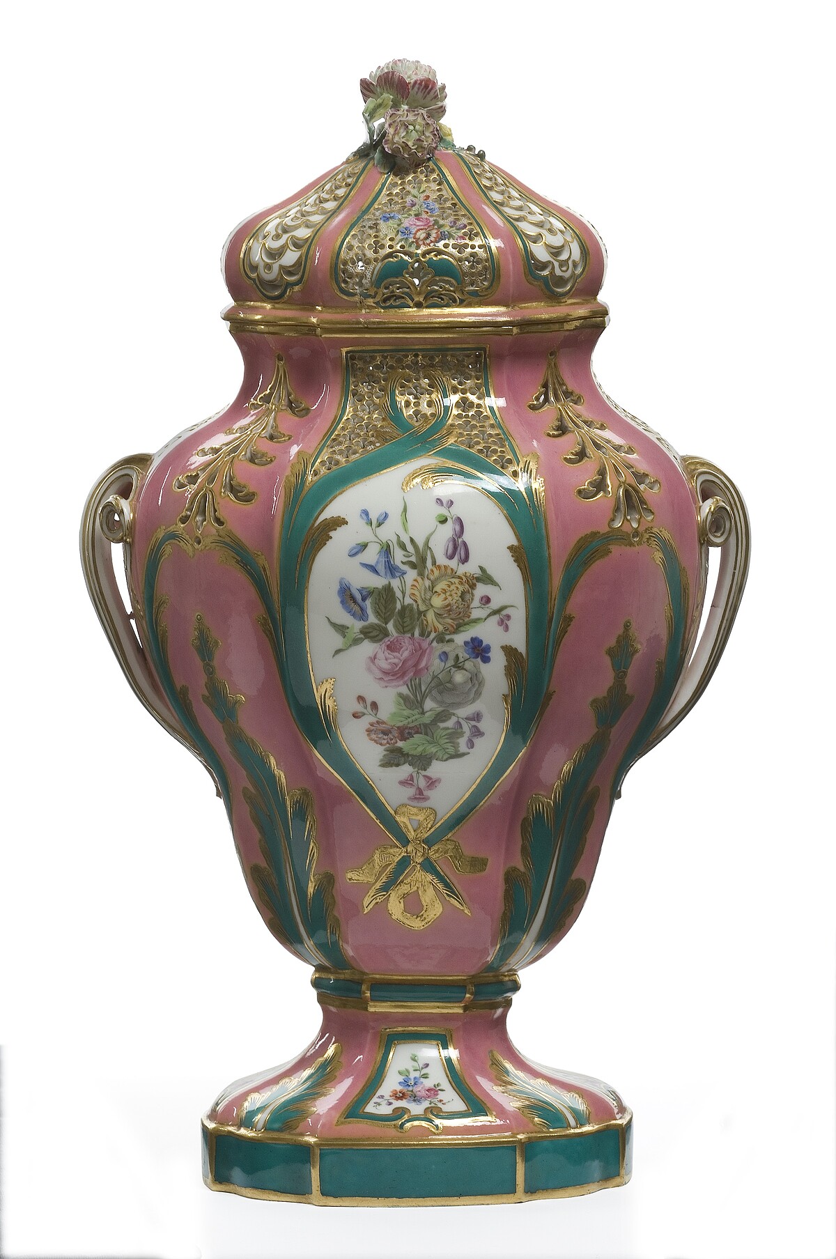 百花香花瓶,最初用於展示乾燥但芳香的花卉。由軟瓷製成,具有多種色彩,以極其逼真的方式再現兩種構圖:一側是花束,另一側是風景。粉紅色和綠色琺瑯這兩款顏色由法國塞夫爾製造廠工藝最為精湛,因此而聞名。