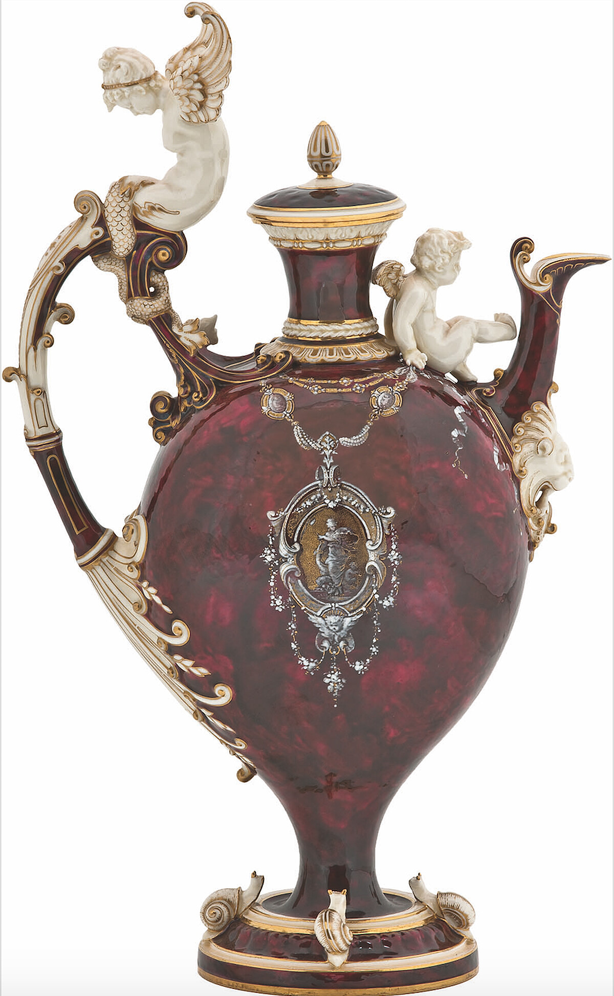 塞弗爾國家瓷器廠,1883—1884年 素描家:Albert-Ernest Carrier-Belleuse 雕塑家:Auguste Rodin 和 Thomas-Jules Roger 畫家:Suzanne Estelle-Apoil 瓷器、琺瑯、鍍金飾邊 高 41.7公分、長24.3公分、寬10.9公分 巴黎裝飾藝術博物館