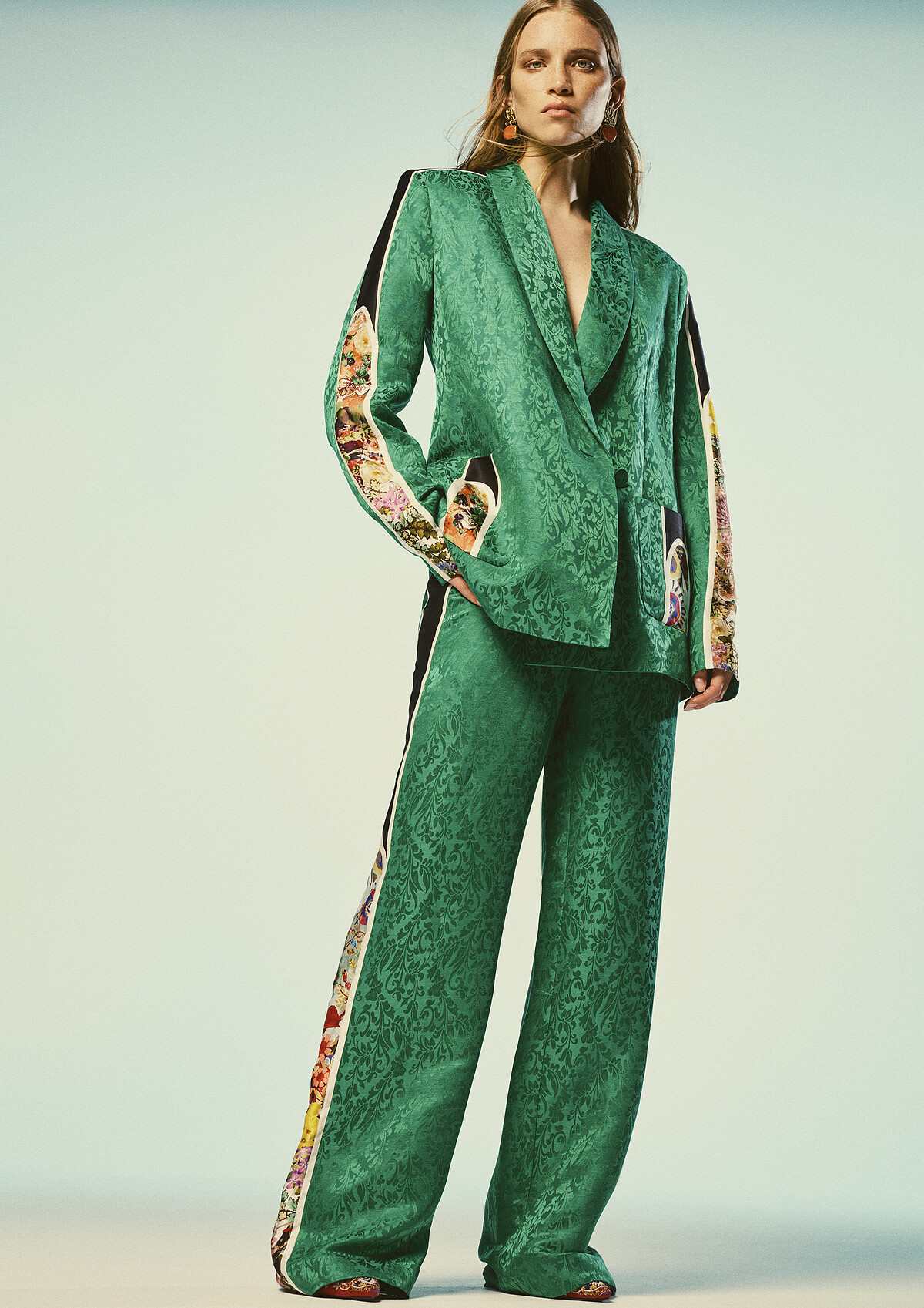 這款以精緻的印度傳統刺繡點綴在西裝上衣與下身褲裝兩側的綠色套裝,正裝氣勢十足。