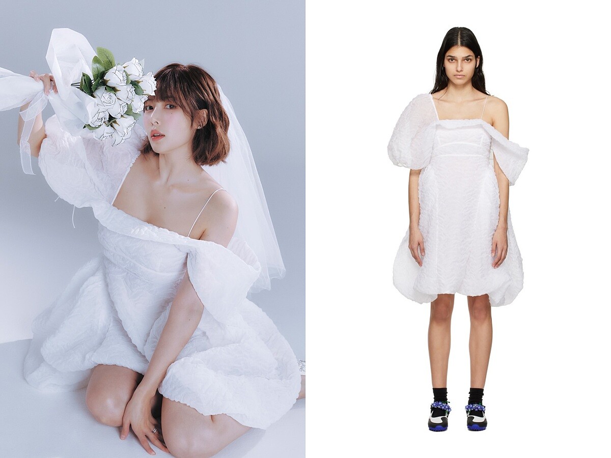 第一套泫雅穿上來自哥本哈根夢幻冷調的設計師品牌Cecilie Bahnsen,在2023春夏系列中推出的白色不對稱澎裙洋裝,純白的婚紗在如同棉花糖蓬鬆般的材質與氣球裙擺的詮釋之下,看來甜美又不失優雅。