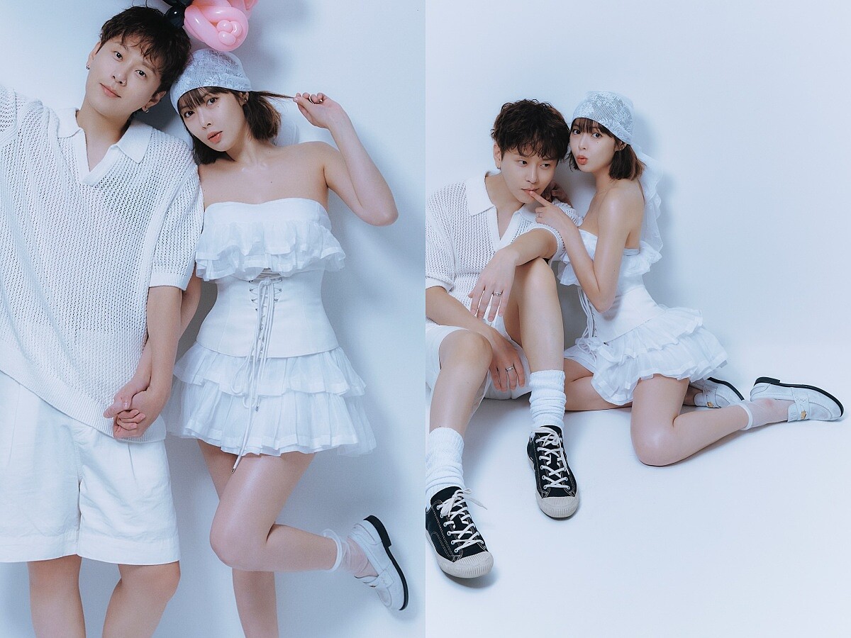 第二套泫雅與龍俊亨都穿上白色系,泫雅換上了Balletcore風格服裝,來自Lisa、Jennie等韓星都喜愛的越南品牌LSEOUL,上身的荷葉平口馬甲搭配多層次荷葉澎裙,搭配學院感的Miu Miu白色樂福鞋,非常有泫雅風格的多元穿搭。