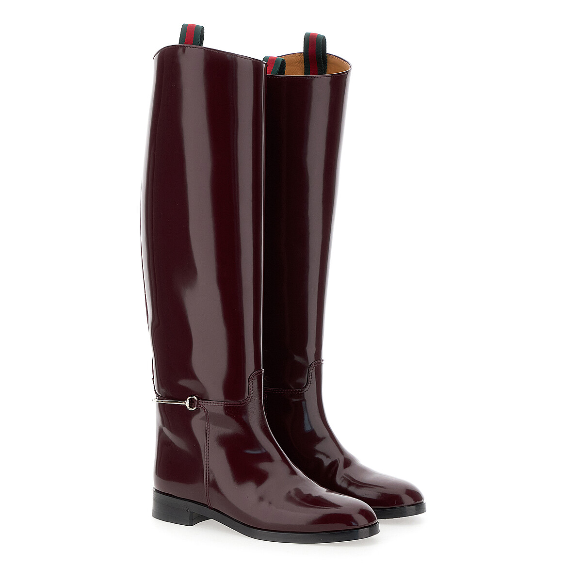 在Gucci 2024秋冬女裝裡,能多次看見激短下身配上及膝長靴的造型公式,透過極端的組合來營造修長視覺,是De Sarno從上一季就很喜歡使用的手法,而這雙長靴採用亮面皮革打造,於鞋後側裝飾馬銜鍊扣,並在鞋筒口上加裝品牌標誌性的織帶,低調之中又凸顯出品牌的識別元素,毫無疑問將成為今年秋冬的人氣聚焦款!