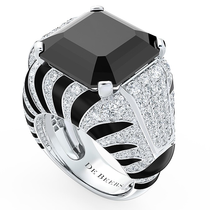 De Beers Forces of Nature 高級珠寶系列 Individuality 鑽石雞尾酒戒指。斑馬斑紋就像指紋,獨一無二,透過俯瞰和側視不同視角,能欣賞到不同的黑漆與白鑽的圖形組。訂價約 TWD 6,550,000