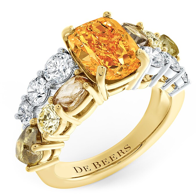 2.03 枕形切割豔彩橘鑽是此款戒指核心!兩側層次鑲嵌琥珀色調的褐色鑽石原石和抛光黃鑽,呼應著長頸鹿斑紋顏色。另一側圓形明亮式白鑽則構成逐漸收窄的線條,暗示著重現動物頸部的優雅纖長體態。訂價約 TWD 386,850,000