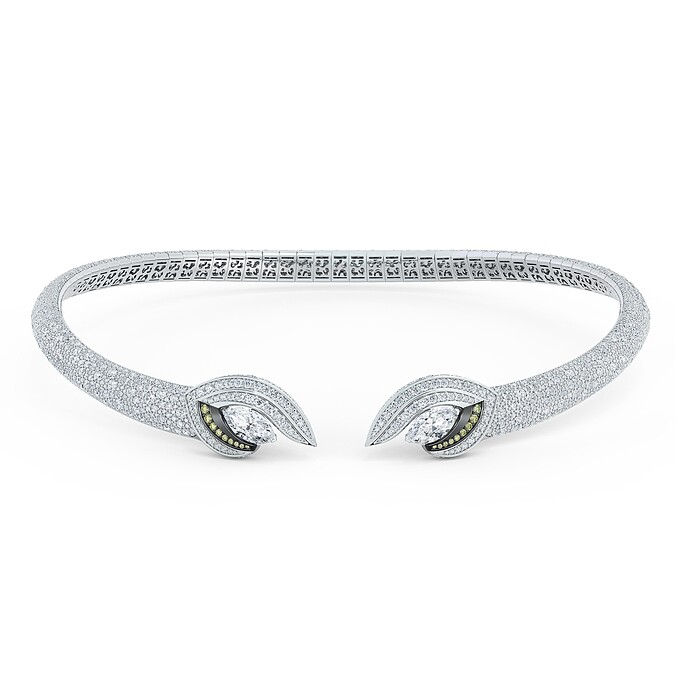 兩顆1.50 克拉欖尖形鑽石象徵豹的銳利眼神,周邊鑲嵌在黑色鍍銠金屬中的珍稀綠鑽,獨特色調更趁豹眼魅力,配戴時綴於鎖骨中心。鍊身以雪花鑲嵌鑽石打造,折射光線自由耀。訂價約 TWD 8,200,000