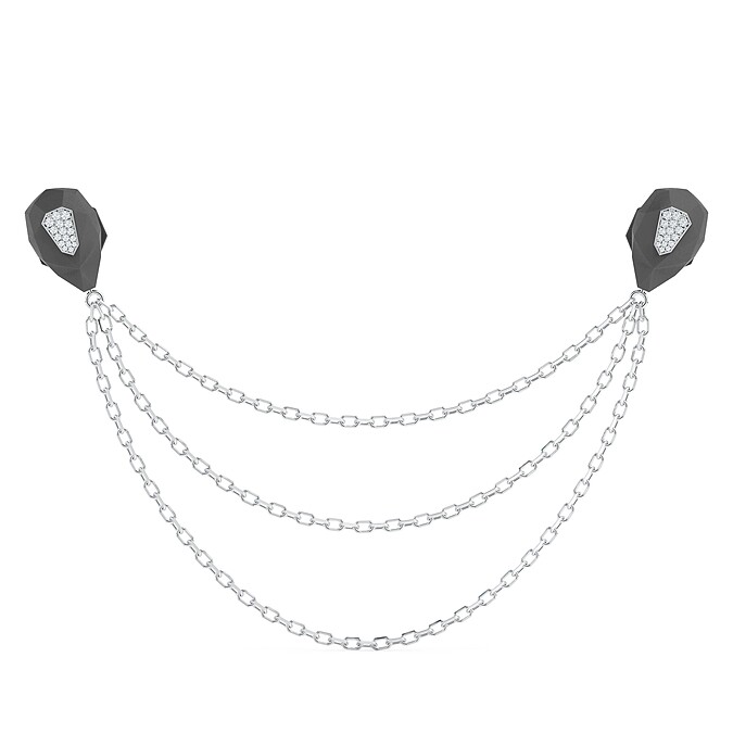 創新、原創且多功能,Fortitude 鍊式領針兩支尖以堅韌且富有彈性的磨砂鈦金屬製成,讓人想起像盔甲的皺摺厚皮。領針使用可拆三層金鍊連接,也變化多種佩戴方式。 訂價約 TWD 655,000