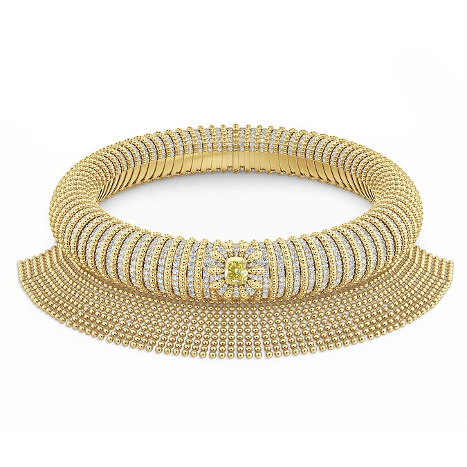 Protection Choker項鍊以將18K黃金和鑽石打造。中央一顆的溫5.19 克拉枕形切割濃黃彩鑽,像是獅王般極具風采,下方的金珠流蘇可拆卸下來,讓作品有多種穿戴方式。訂價約 TWD 19,600,000