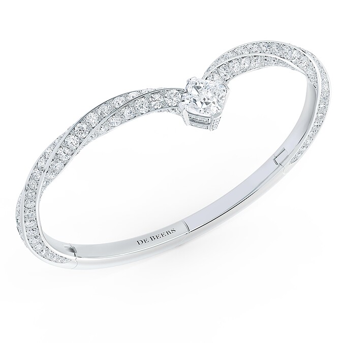 Spirituality 手鐲旋扭的白金鑽石線條盤繞手腕,並鑲嵌一顆2.08 克拉枕形鑽石作為點睛之筆。V 形優雅點綴腕間,彈簧設計使其可輕鬆穿脫。 訂價約 TWD 4,900,000