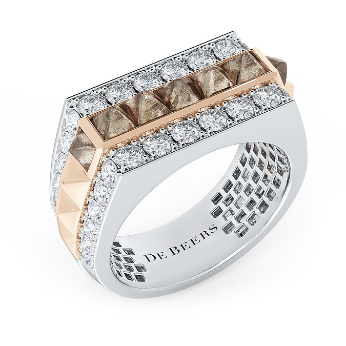 風格時髦、稜角分明的 Stability 戒指鑲嵌多個金字塔形褐色鑽石原石,兩側採用仿原石形狀的金字塔金屬。鑽石原石與密釘鑲白鑽對比,凸顯戒指輪廓的力量與堅實。 訂價約 TWD 980,000