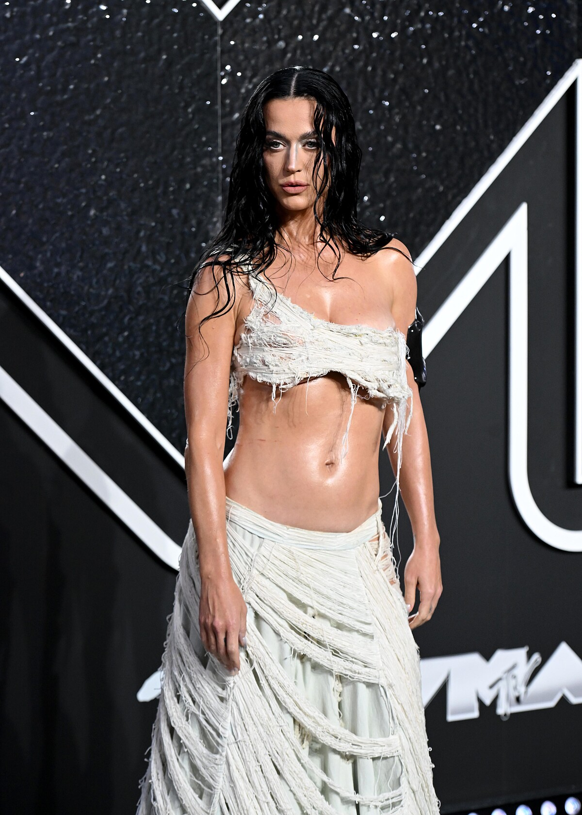 Katy Perry的紅毯戰袍選擇來自Who Decides War 2025春夏的秀款,破敗的布面垂掛在她的身上,露出精實的腹肌線條,一頭浸濕的捲髮和身體上的光澤,使她散發著一種野性的魅力,你可能有發現,她的背後還印了一個QR Code,掃碼進入後內容是關於全新專輯《143》的資訊,是個特別有趣的小巧思。