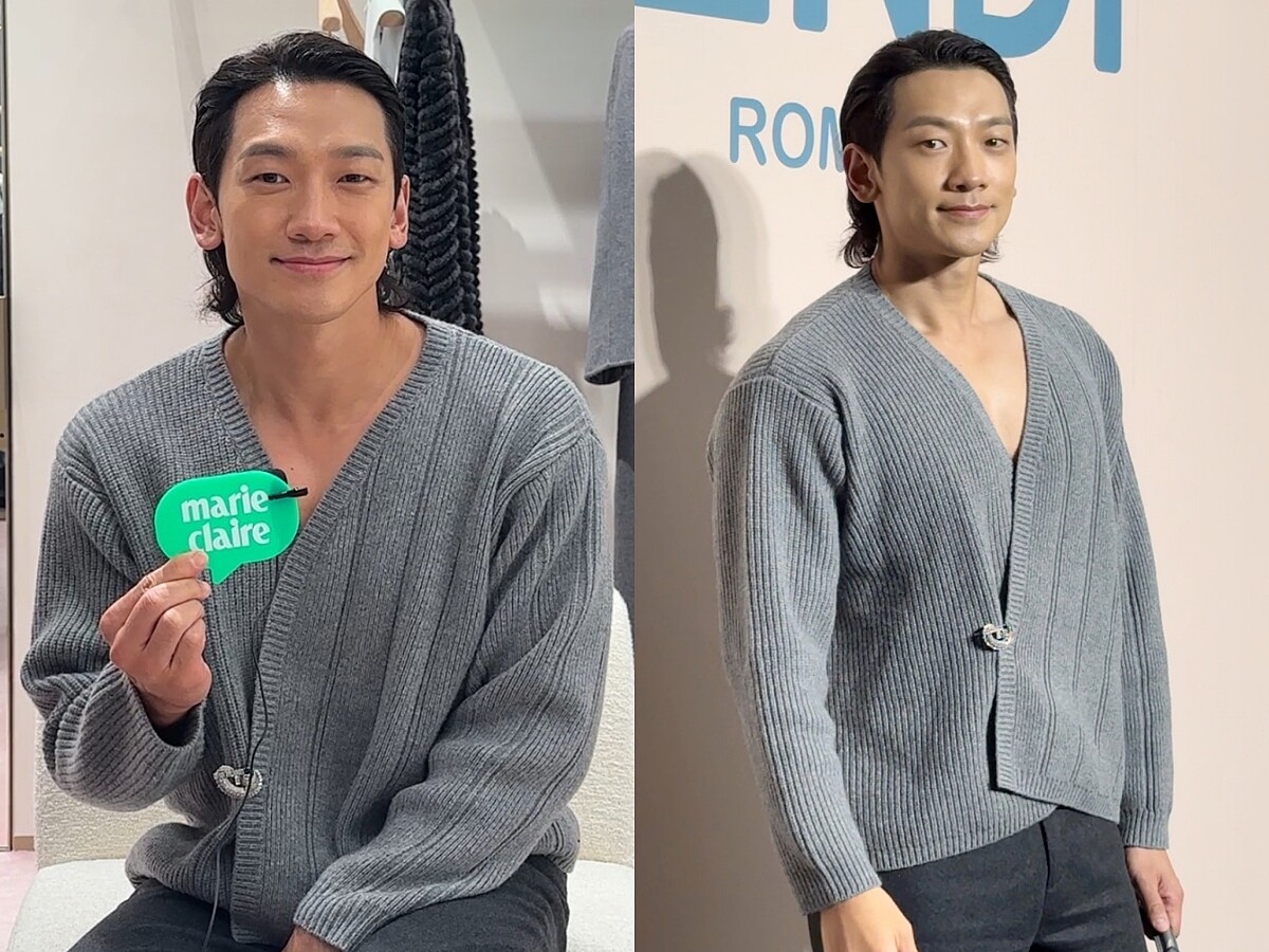 Rain時隔5年再度來台出席FENDI女裝專門店開幕活動,不同於抵台時的一身帥氣黑色系造型,換上灰藍色羊絨開襟衫,並巧妙以水晶造型別針收合上衣,V字領口隱約透出壯實的肌肉線條,搭配秋冬新包款Peekaboo Soft,全後梳的濕髪造型散發都會時髦氣息,出場時更是親切放送粉絲福利,並誠意十足的以秀中文打招呼:「大家好,好久不見,我是Rain!」