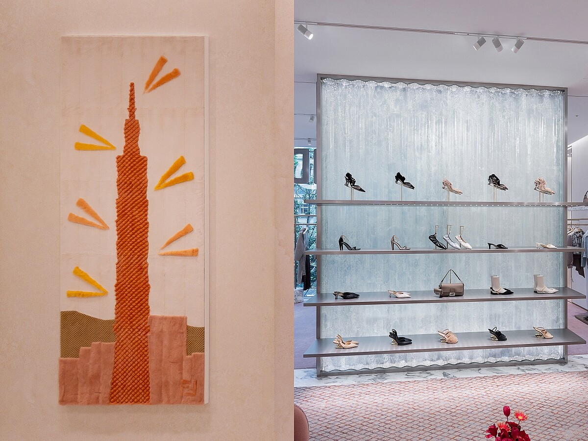 店內二樓有一面由義大利玻璃工坊特別訂製、以羅馬噴泉水波紋為概念打造的玻璃牆,展示各款鞋履,牆上也搭配著由FENDI羅馬皮草工坊製作的台北101作品。