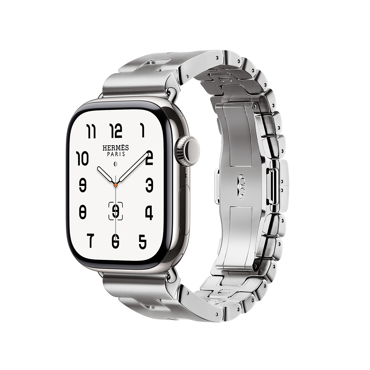 Apple Watch Hermès Series 10 系列首款全金屬錶帶!緞面拋光精鋼材質錶鍊刻有H字樣,並備有兩個可拆卸鏈節,簡單動作即可自行調節錶帶。